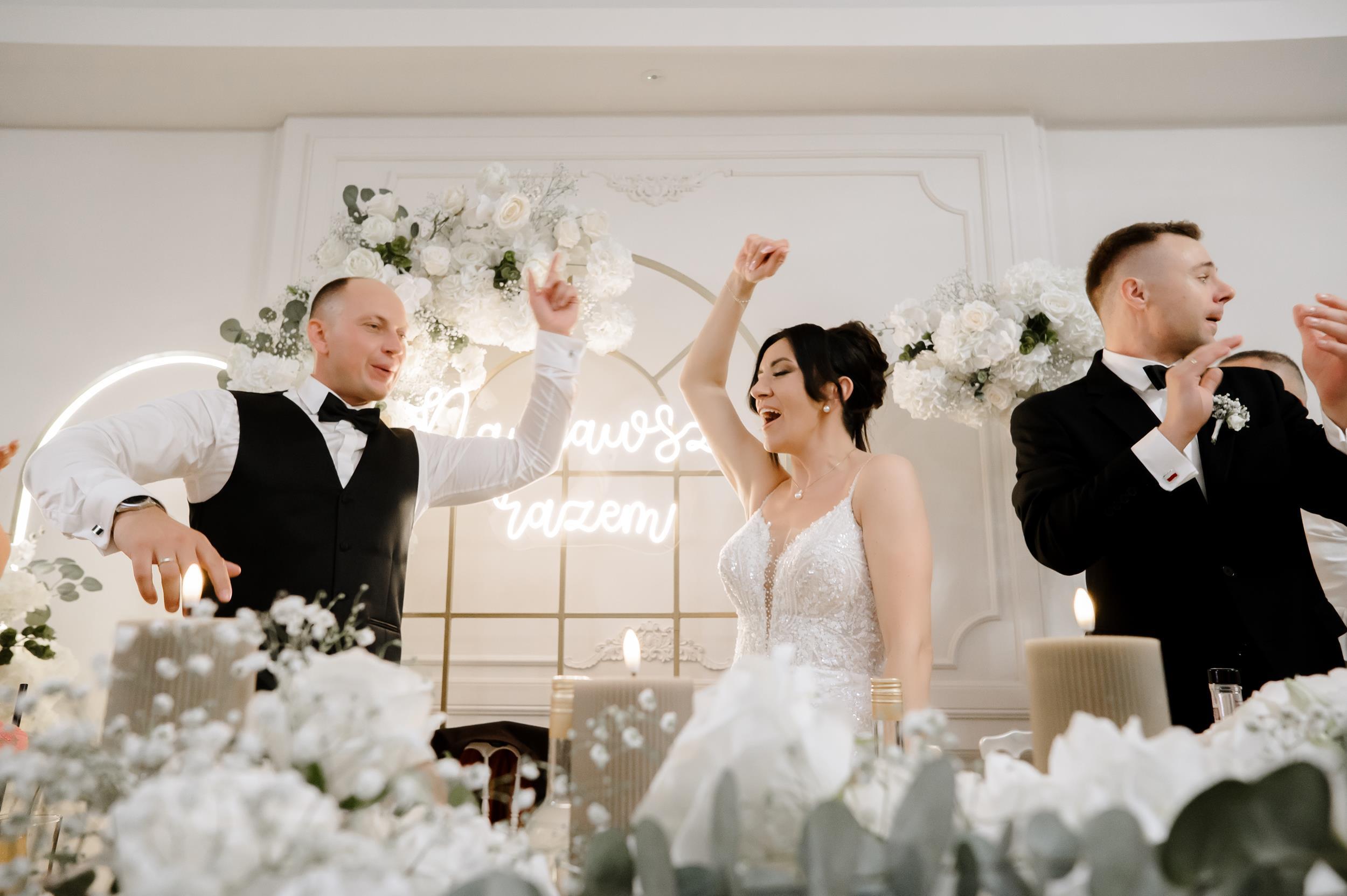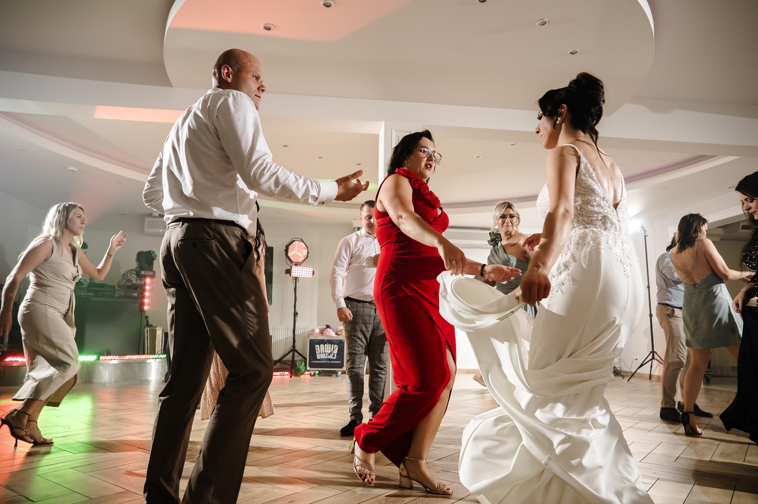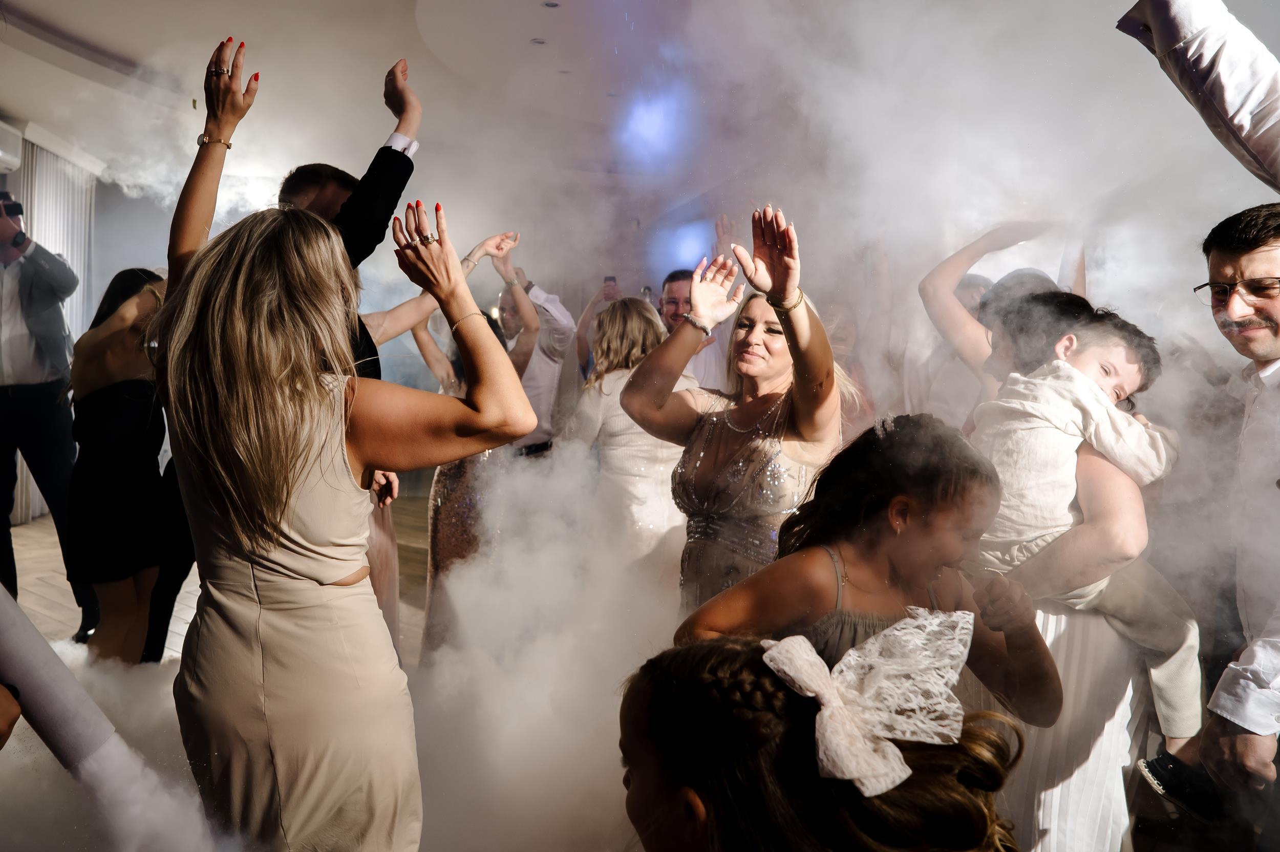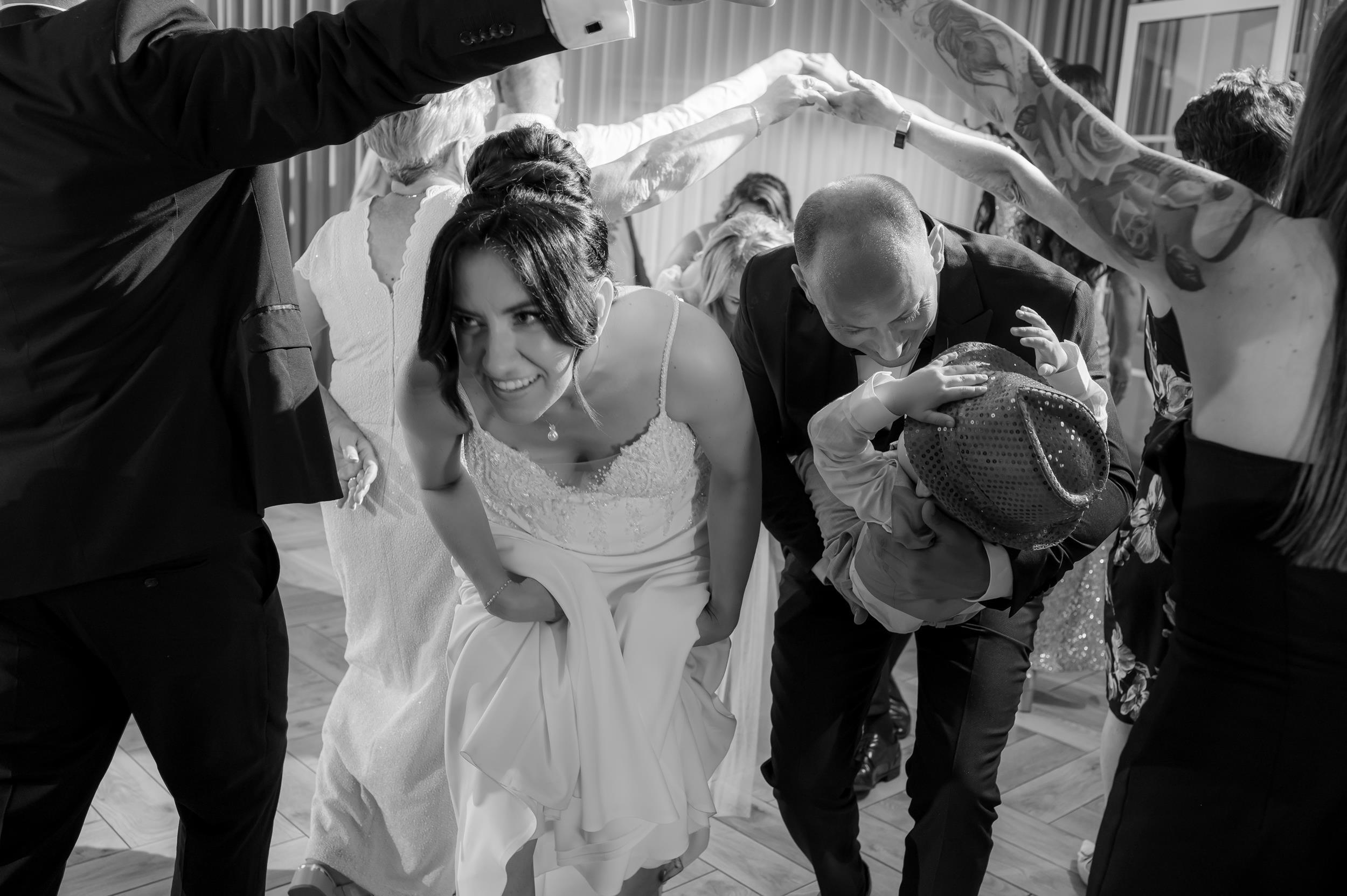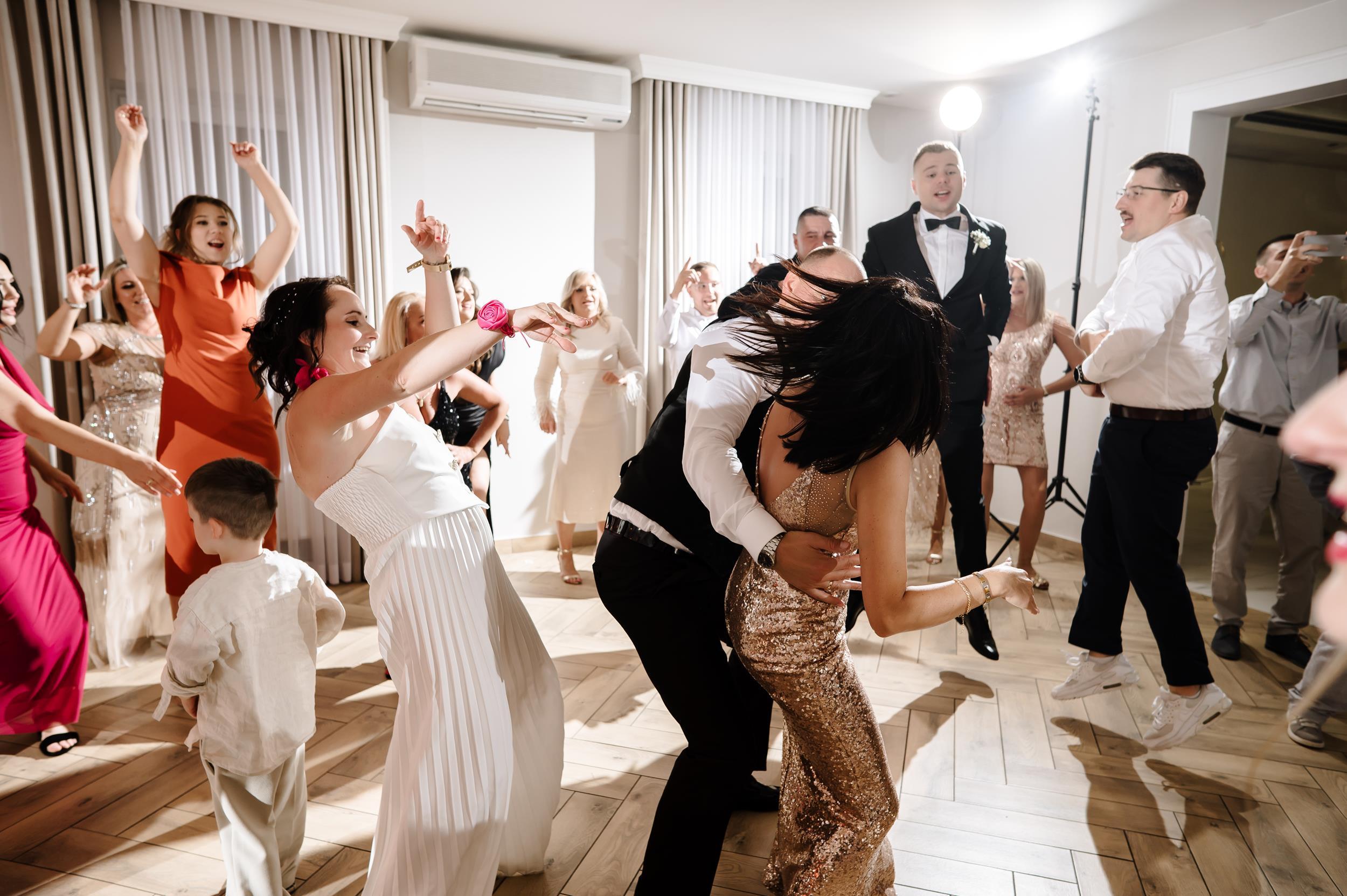 Po ceremonii przenieśliśmy się do Sali Honotu w Lasowicach, gdzie zabawa rozkręciła się błyskawicznie. I nie – to nie są puste słowa. Ten parkiet naprawdę płonął! Dawno nie widziałam tylu roześmianych twarzy i tak dobrej energii. Były klasyczne tańce, rodzinne wygłupy i momenty, które aż prosiły się o zatrzymanie w kadrze.